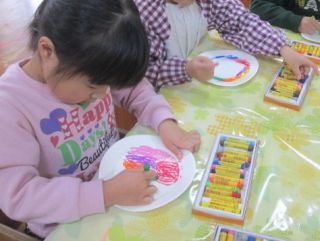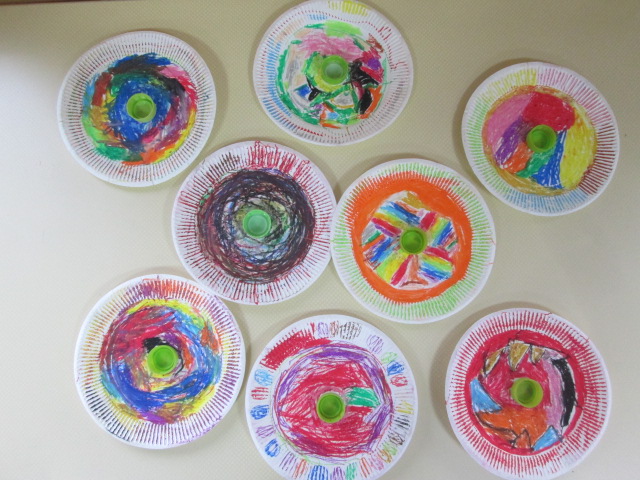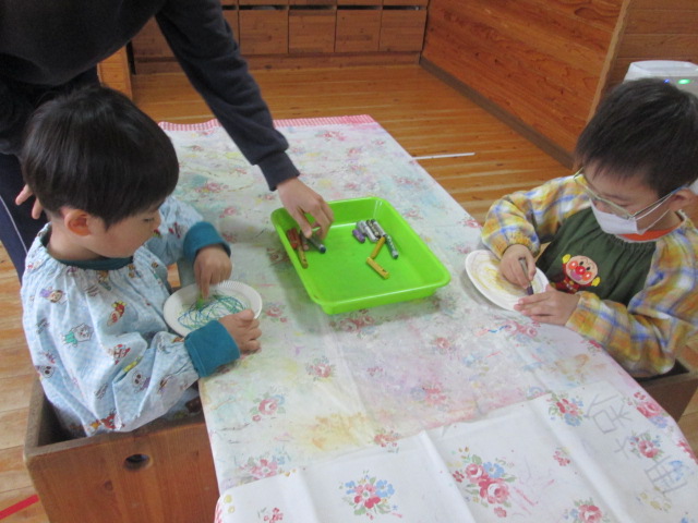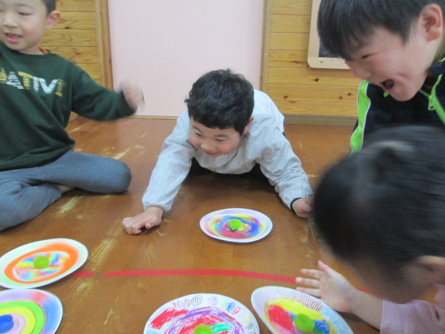 まんまるでは、コマあそびをしましたよ~!真っ白な紙皿に、自分で好きな色や模様を次々と描いていき、とってもカラフルなコマが仕上がりました。世界で一つだけの自分のコマ、眺めているだけでもうれしいようです。作ったコマを手に、いざ・・・!クルクルクル~と回るコマに満面の笑みを浮かべたり、歓声をあげ喜んでいました。最後には、全員で輪になって「せーのっ!」の声に合わせてコマを回しました!一斉に回るコマに、お友だちと顔を見合わせ「回ったね!」と嬉しそうな子どもたちでした。