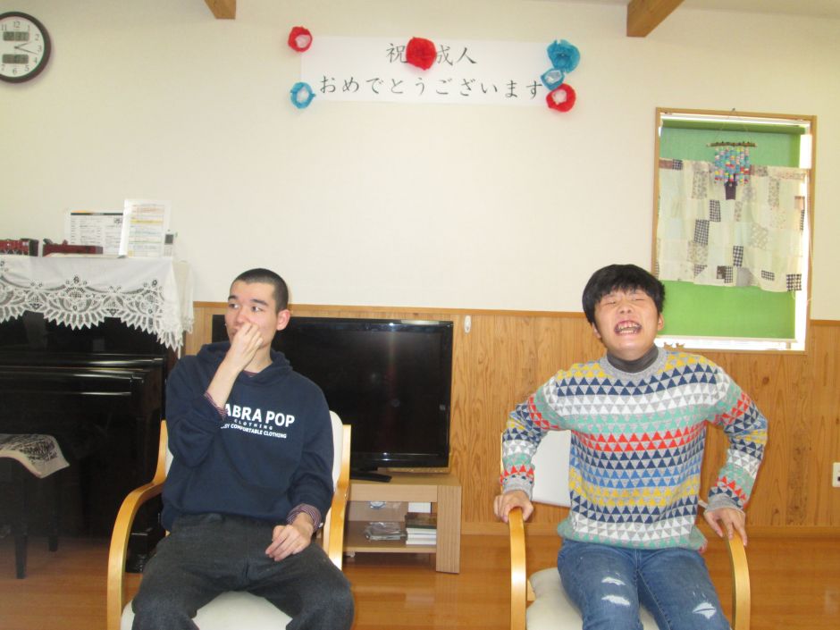 先日、成人の日を迎えられた2名の仲間をみんなでお祝いしました! 想い出スライドショーを鑑賞すると、皆さんの大歓声や大爆笑の中、主役の2名は自分の姿にうれしそうに見入っていました! ご成人 おめでとうございます!