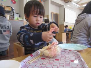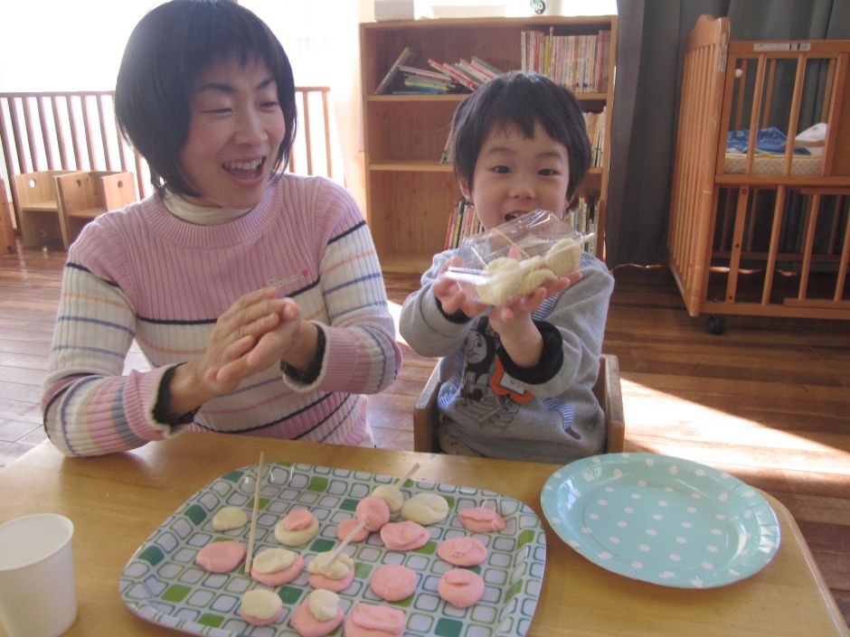 あははでは、いつも行事が終わるたびにふりかえりあそびをしています。この日は、かぶとむしグループの子どもたちが小麦粉ねんどを使って先日のもちつき会のふりかえりあそびをしました!小麦粉ねんどは、とってももちもちぷにぷにしていて子どもたちの大好きなあそびでもあります!小麦粉ねんどを使っておもちをつくり、パックにつめたり、丸めて串にさしたりしてお団子の完成!みんな、もちつき会の経験もあって楽しみながらお団子づくりをしました。いろんな形のお団子ができていましたよ!