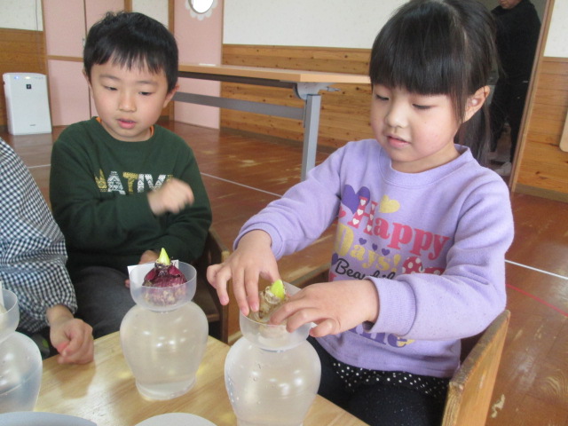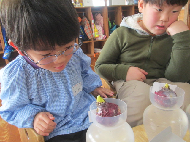 今、年長さんはヒヤシンスの生長を見守っています。自分の球根と友だちの球根。生長をくらべてしまいますが友だちのヒヤシンスが咲いたら一緒になって喜ぶかわいいみんな。先に咲いてもうれしいし、最後に咲いてもきっとうれしいはず!いい香りが風に乗ってふんわり漂ってきます。もうすぐ卒園式です。