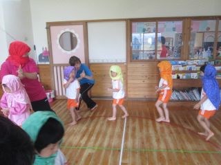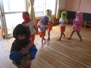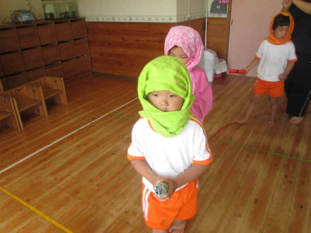 とんぼグループのお友だちは忍者ごっこが大好き☆うたあそびの「忍者のはやとおそと」ではマントを被って忍者に変身します(*^-^*)音楽に合わせて早く走ったり、ゆっくり歩いたり・・・忍者になりきっています!!とくにゆっくり歩く際は、足音が聞こえないぐらいそーーーっと歩いています!楽しくって「もう1回したい!!」と元気いっぱいのとんぼさん♪また楽しいあそびをいっぱいしようね☆