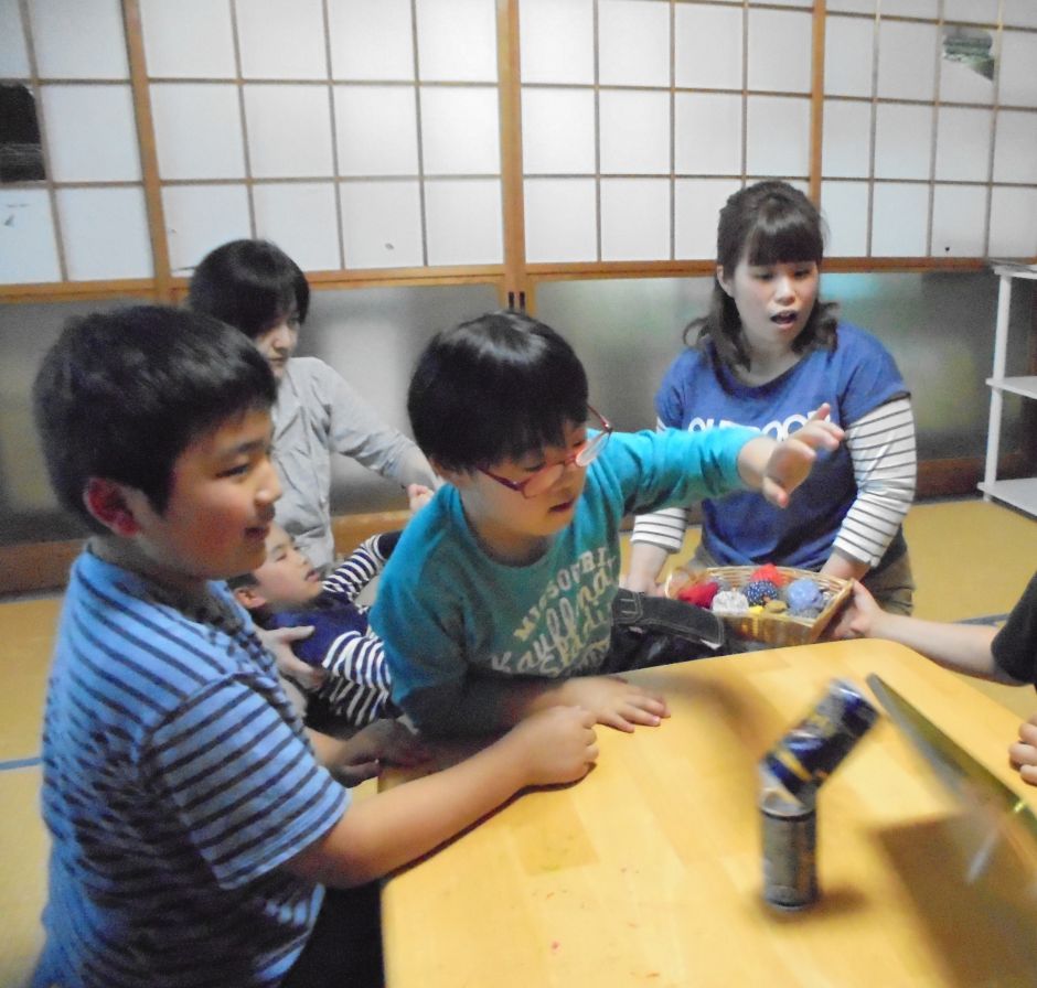 廃材を使って、どんなゲームで楽しめるのかをよく考えています。今回は、空き缶とお菓子の缶箱のフタ、おじゃみを使う遊びに挑戦しました!