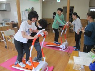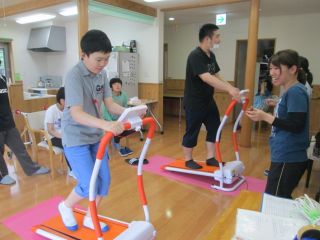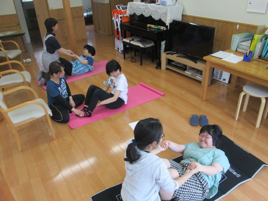 毎週月曜日の午後は、体操の時間です。 初めにストレッチで体をほぐしたり、バランス運動をします。腹筋運動にも挑戦します。一人で身体を起こす方、手伝ってもらう方と様々ですが、皆さん10回くらいできるのですよ!! 今年からは、ウォーキングマシーンを取り入れました。皆さん怖がるどころか、とても楽しいみたいです♪回数を重ねるうちに、リズムよく歩けるようになりました!!