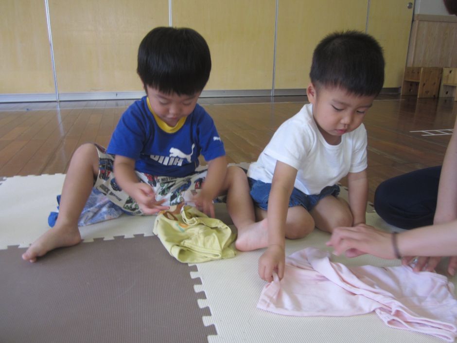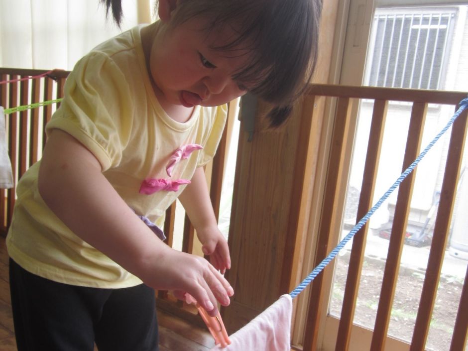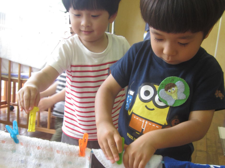 梅雨に入り、室内であそぶことが多くなりました。今週は、洗濯ごっこあそび。洋服を広げて…干して…最後に…洗濯ばさみでとめました。次は、洗濯物をたたみました。先生がたたんでいるところをじっと見て、丁寧にたためました。お母さんのお手伝いができるといいな!