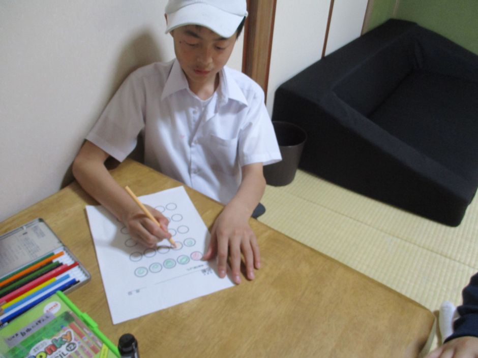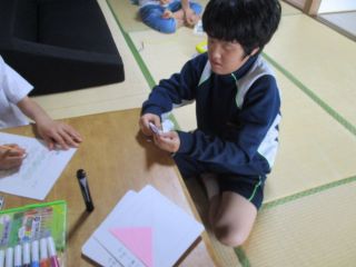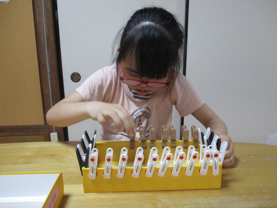 今回、¨初めて¨個別で行う活動内容を考えてみました。手先を使うことを中心に、折り紙で¨やっこさん折り¨、ストローの¨ひも通し¨、¨洗濯ばさみとめ¨など数種類を用意して、子どもたちに選んでもらいました。折り紙では、手順書を見ながら1つ1つていねいに折り、できあがると「かんせーー。」と嬉しそうに職員に見せてくれました。洗濯ばさみとめは、全部とめ終わると「できたよー。」と言って、次の違う活動にも挑戦していました。活動時間は10分ほどですが、みんな集中して参加していました。