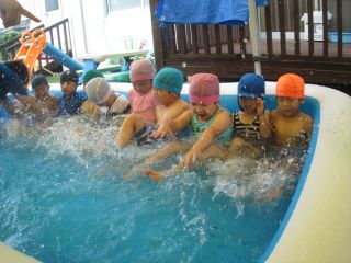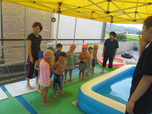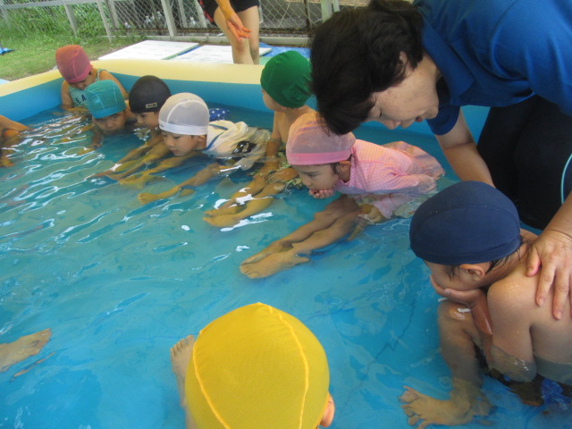 7月4日(水)まんまるでは待ちに待ったプールあそび☆水着に着替えて、水泳帽をかぶり準備OK♪いざプールへ!!!!「つめたーい!」「気持ちいいね~」と子ども達も大はしゃぎ(*^-^*)今日は顔付けに挑戦!!まずは顎をつけ、鼻をつけそして顔をつけていきました!ドキドキしながらも自分から挑戦しようとする姿にお兄さん、お姉さんになったなぁと感じました!これから色んな事に挑戦していこうね!夏を楽しむぞーーー!!