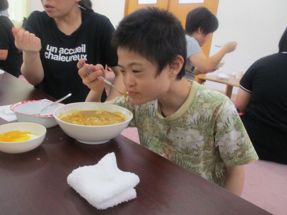午前中のカレー作りでは、お米を研いだり、野菜を切ったりする作業をしました。お米を初めて研ぐ子もいて、職員と一緒にきれいに洗うことができました。切る作業では、手でしっかりと野菜を押さえて、上手に包丁が使えていました。