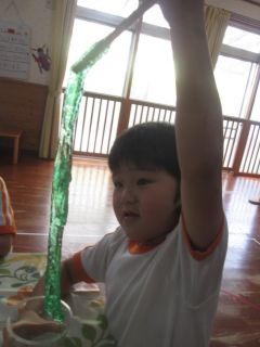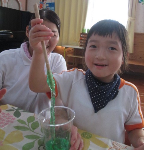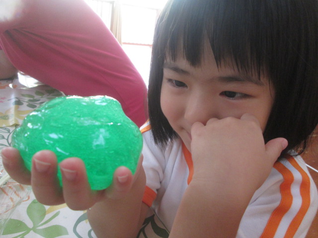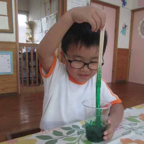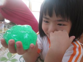 気が付けばもう9月!まんまるの子どもたちは、夏はたくさんの感触あそびをしました☆スライム・小麦粉・片栗粉・泡‥‥今回は、スライム作りについて紹介します。色水を用意しておいて、そこに「魔法の粉」を入れて混ぜると・・・少しずつトロミがついてきて、箸を持ち上げるとびよ~~~~ん!!!子ども達もそれを見て大興奮!!触ると、ひんやり気持ちいいね。手にくっつきそうでくっつかない不思議な感触もなんだか魅力的。また作ろうね♪