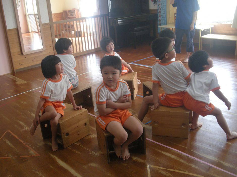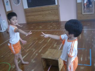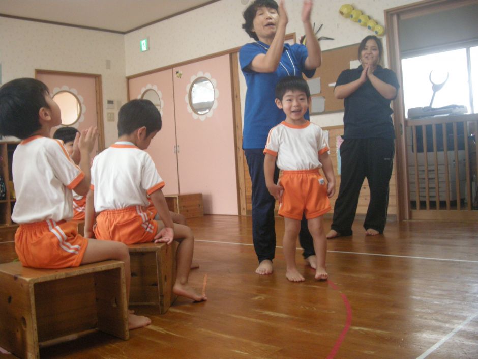 みんなで椅子取りゲームをしました。始まる前から、「一番になるぞ~!」と気合が入っていた子どもたち!音楽に合わせて回っていき、「ピー!」と笛の合図とともに椅子へダッシュ!!お友だちに取られ悔しそうでした。椅子がどんどん少なくなっていき、みんな誰が最後まで残れるかドキドキ・・・。一番でも二番でも頑張ったお友だちには、大きな拍手を送りました。