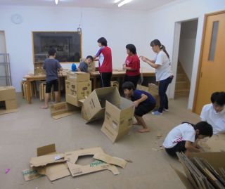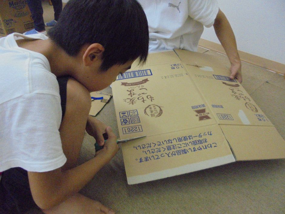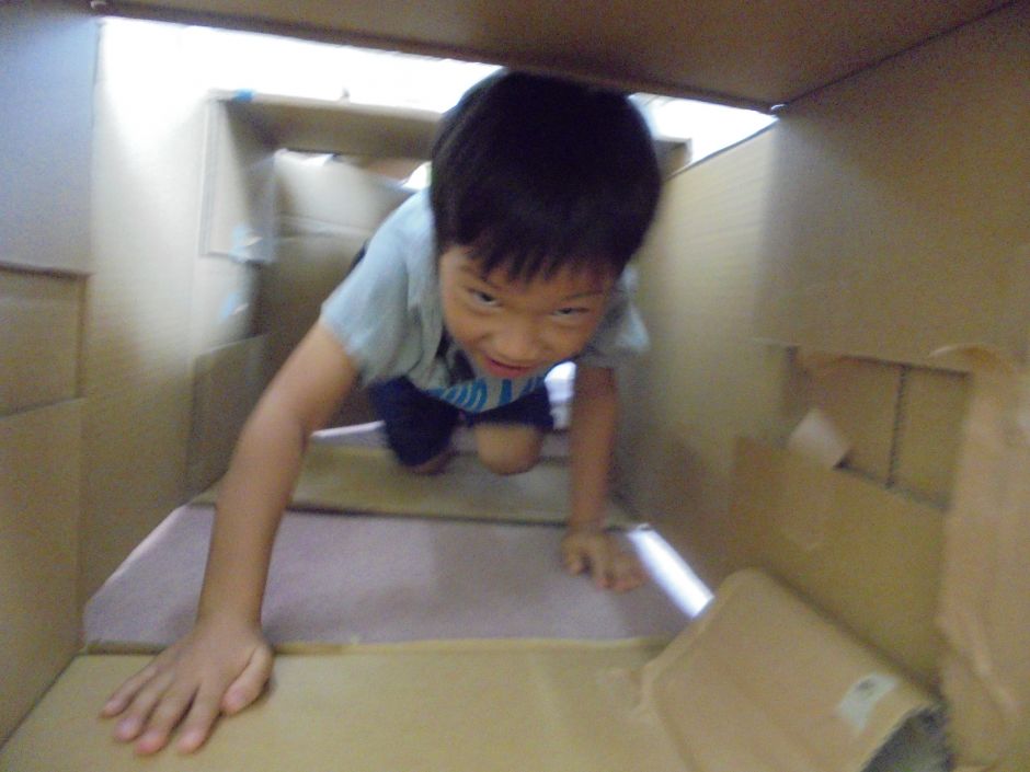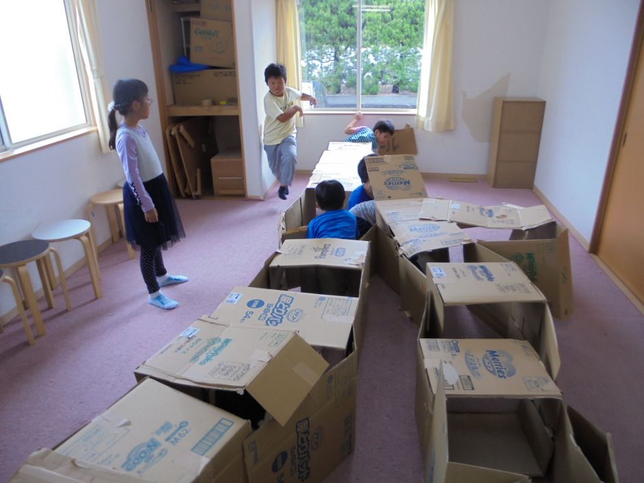高学年は、ペンやひも、テープなどの材料を使い、電車や家、高級枕?など自分たちでアイデアを出しながら気の合う仲間と協力して作りあげました。低学年は段ボール迷路で遊びました。四つん這いで、段ボールの中をゴール目指しあっちやこっちに行って、時には頭を出しゴールを確認しながら遊びました。迷路の合間にチラッと見える姿に、ワクワクしながらとても盛り上がった時間になりました!