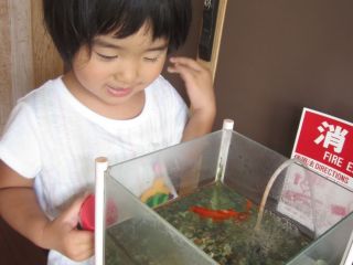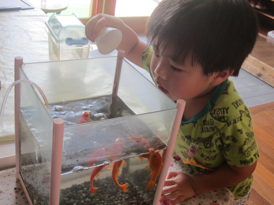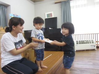 かぶとむしにグループになると、お当番のお仕事があります。初めての経験でドキドキしたりニコニコしたりと様々な表情を見せてくれます。まずは、好きなバッチを選びます。そして、みんなに挨拶をして金魚さんにエサをあげます。この金魚さんのエサは大人気のお仕事です。あともう一つのお仕事は,帰りのお集まりでお友達におたより帳を渡します。みんなから「ありがとう」と言われ、嬉しくて笑顔を見せる子どもたちです。