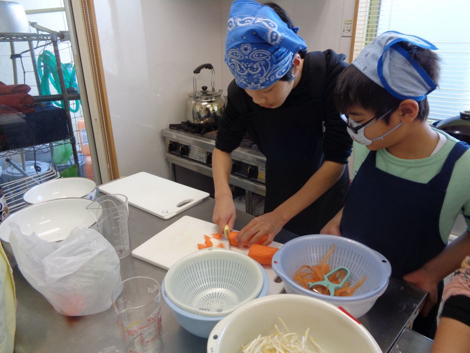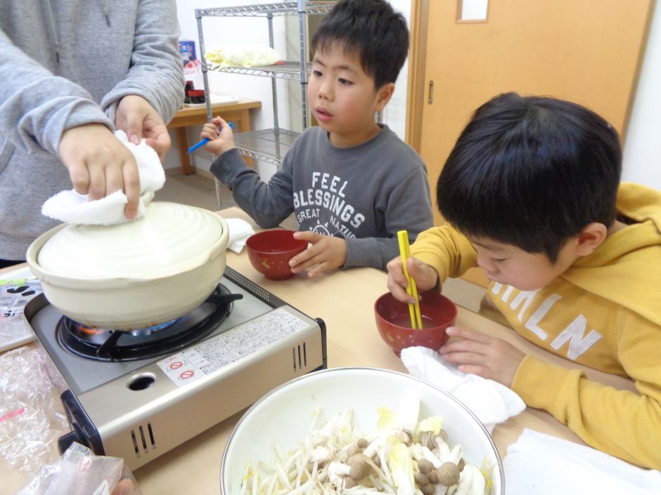 冬と言えば・・・お鍋!昨年末にみんなで鍋パーティをしました!それぞれに役割分担し、材料を切ったり、会場のセッティングをしたり、味付けをしたり、後片付けまでしました。高学年は、準備や片づけに大活躍でした。料理の上手な男の子が多かったです!お鍋を楽しみにしている低学年♪朝から「俺、鍋奉行やとよ」と、待ちきれない子もいました!「食べない・・・」と言っていた子も、何度もおかわり♪大盛り上がりのパーティでした☆