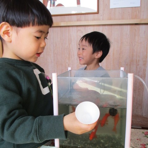 毎日、朝のお集まりでは「お当番したい!!」という声がたくさん聞かれ、お当番にとても期待を持って取り組んでいます!お当番さんは、金魚やメダカにエサをあげたり、おたより帳を返すお仕事をしてくれてお当番の子どもたちの表情はとてもいきいきとしています♪