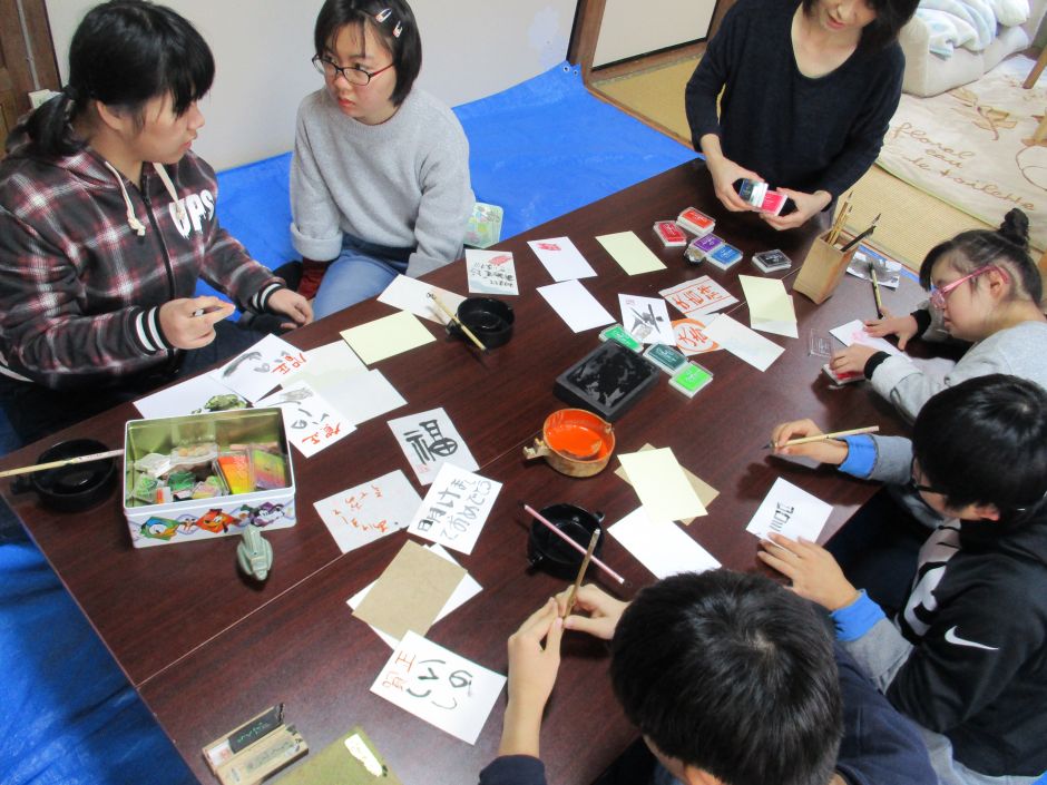 黒色と朱色の墨で、早速「明けましておめでとう」を書き始めたり、先生の見本を見て、「賀正」や干支の「いのしし」、または自分の名前を書き続けるメンバーもいました。