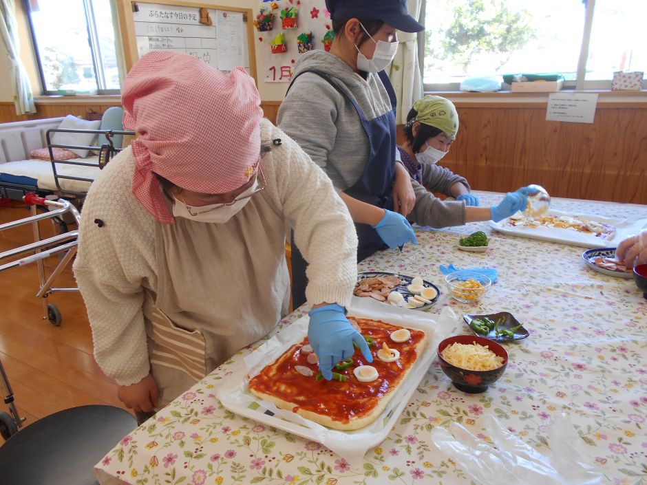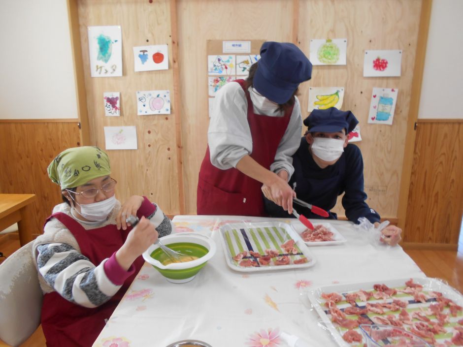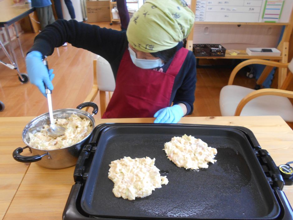 1月は、クッキング月間!!19日にはピザパン26日にはお好み焼き を作りました。 皆さんひとりひとりに任された工程を、切ったり混ぜたり一生懸命!そして、できたてを食べる時も一生懸命!もっと味わって食べましょうよ~( ̄▽ ̄;)今週末には、久しぶりのカレーライスを作ります!きっと今度も、「カレーは飲み物でした・・・」となりそうですね(^_^;)