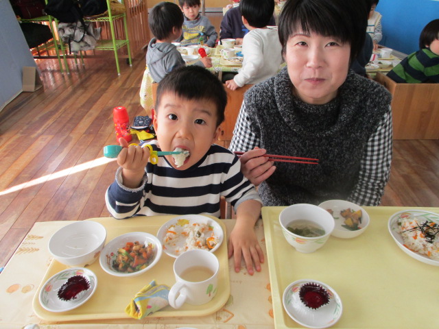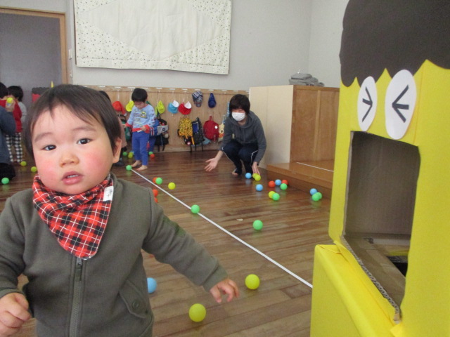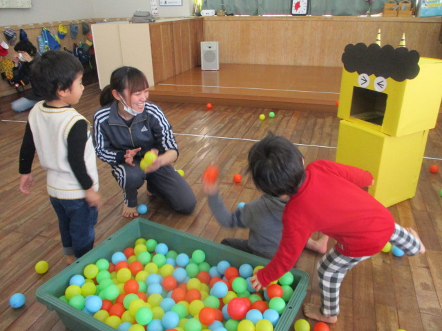 暦の上ではもう春となりましたね。「あはは」でも節分の豆まきをしました!泣き虫オニ、いやいやオニ、怒りんぼオニも倒せるようにカラーボールを豆に見立てて、「オニは~そと!福は~うち!」と元気にみんなでボールを投げました♪給食では「煮干し寿司、鶏肉と大豆の揚げ煮、麩のすまし汁、ゼリー」をお母さんと一緒に食べ、しっかりとオニを払うことができました!新しい年を迎え今年も健康な1年が過ごせますように^^