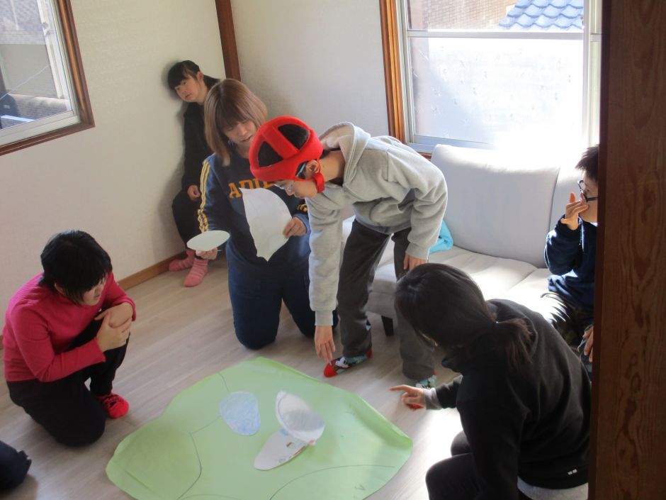 ると、「変な顔になっちゃった。」と照れ笑いを見せる子もいました。周りからの大笑いする声が上がるなど、正月遊びにふさわ