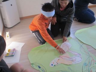 いきました。個性豊かでカラフルなパーツができあがったところで、福笑いスタート!タオルで目隠しをして、周りからの「もう