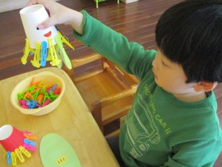 物をつかんで容器に入れたり、洗濯ばさみではさむ等して、