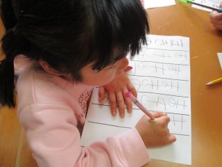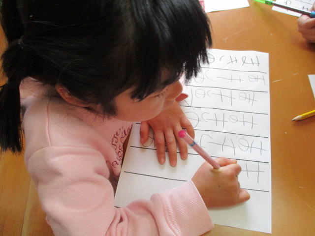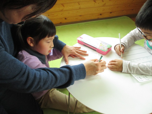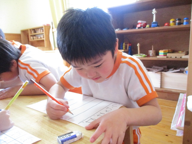 年長児のみつばちグループの子どもたちは、3学期になるとお昼寝の時間が「お勉強の時間」になります。みんなでシューズを履いて、筆箱を用意して気合を入れてお勉強です!今日は名前の練習!!練習を積み重ねるごとに、自分の名前だけでなく苗字まで書く子どもも!「おうちで練習してきたよ!」と言うくらい一生懸命な子どももいます♪課題に取り組む姿や表情は、真剣そのもの。その調子その調子!みんな、その一生懸命さで1年生になってからもいろんなことにチャレンジしてほしいな。