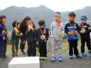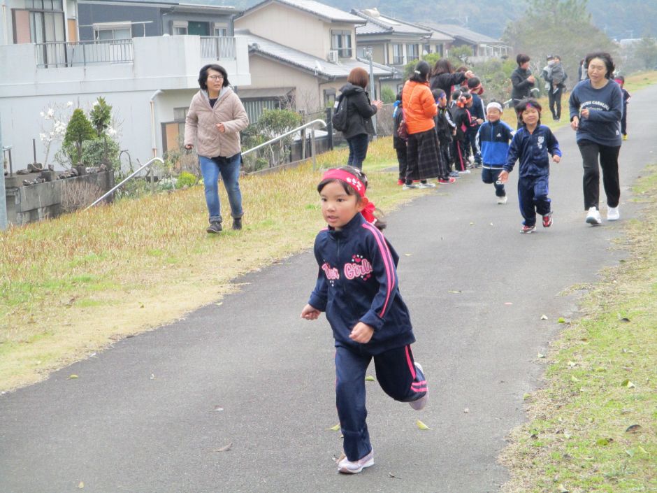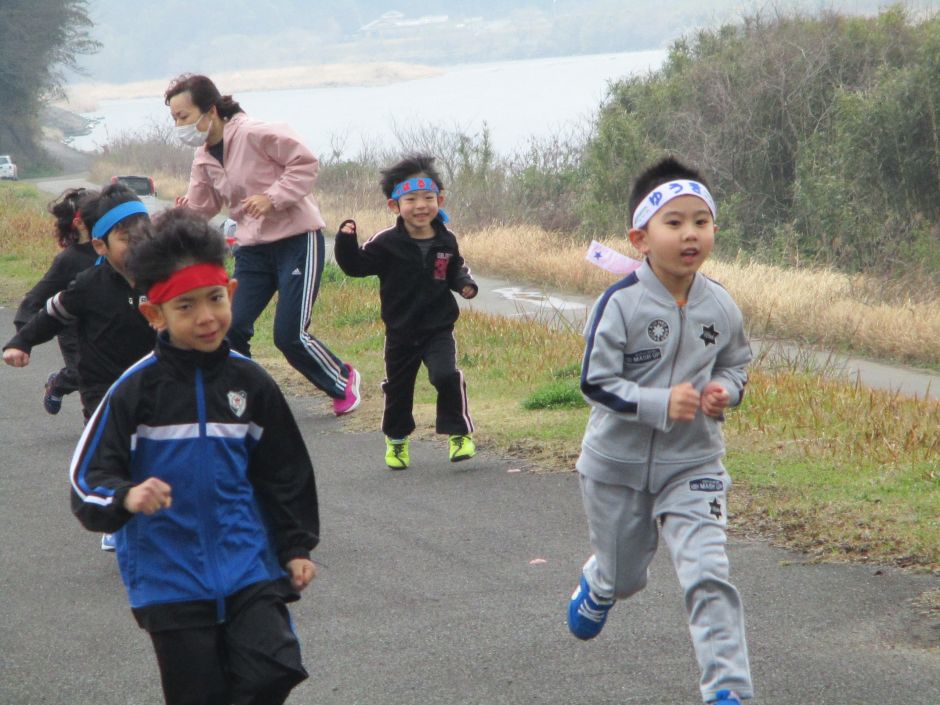 7日(木)に三角公園でマラソン大会を行いました。2月に入り、園庭や三角公園で練習を行っていき、体力つくりに頑張っていた子供たちでした。楽しく走れるために、「USA」の曲をかけて練習しました。当日は、雨もパラパラ降ったり風もありましたが、スタートし始めた途端天気が味方してくれました。お母さんからハチマキをしてもらい、応援もしてもらったことで、長い距離を最後まで走りきることが出来ました。 お母さん方の手作り豚汁を食べておいしかったです!