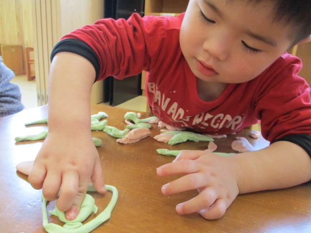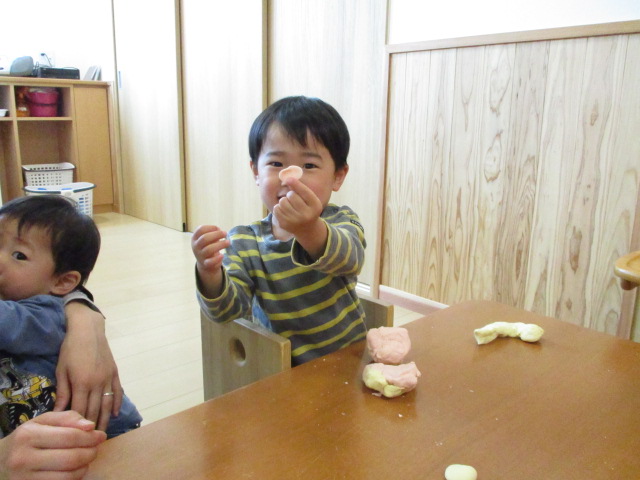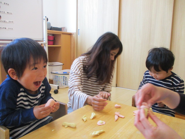 お母さんたちと一緒に小麦粉ねんどあそびをしました。