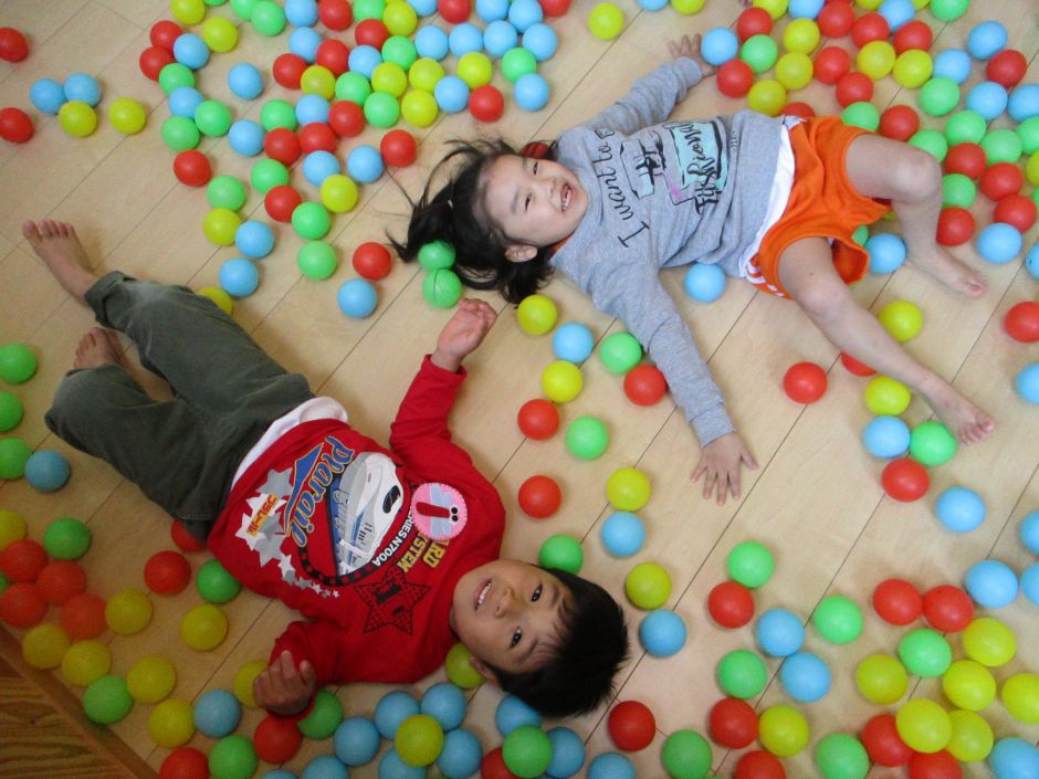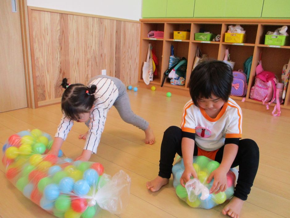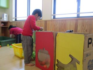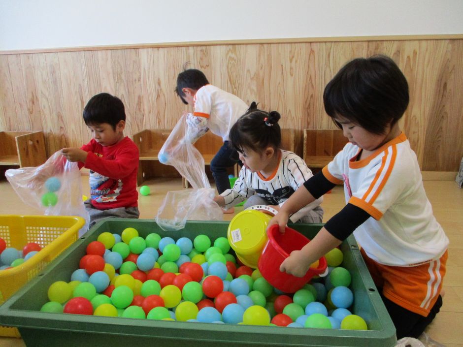 とんぼグループの遊びの中で、カラーボールを使ってあそびました。部屋いっぱいにボールを出して、寝転んだりボールを足で蹴ったりと、楽しんでいた子供たち!!(^-^) また、ボールを袋に入れ「よーいドン!」と競争を楽しんだり、色分けしながら「緑は・・・メロン。」「赤は・・・りんご。」と箱に色分けする‘お仕事‘をしてくれましたよ!
