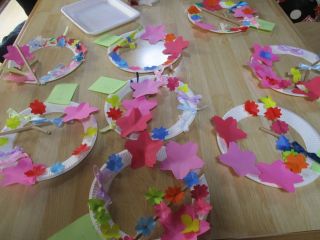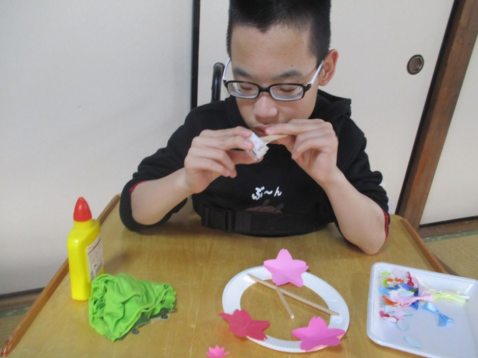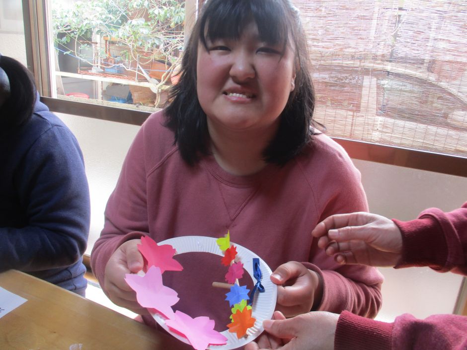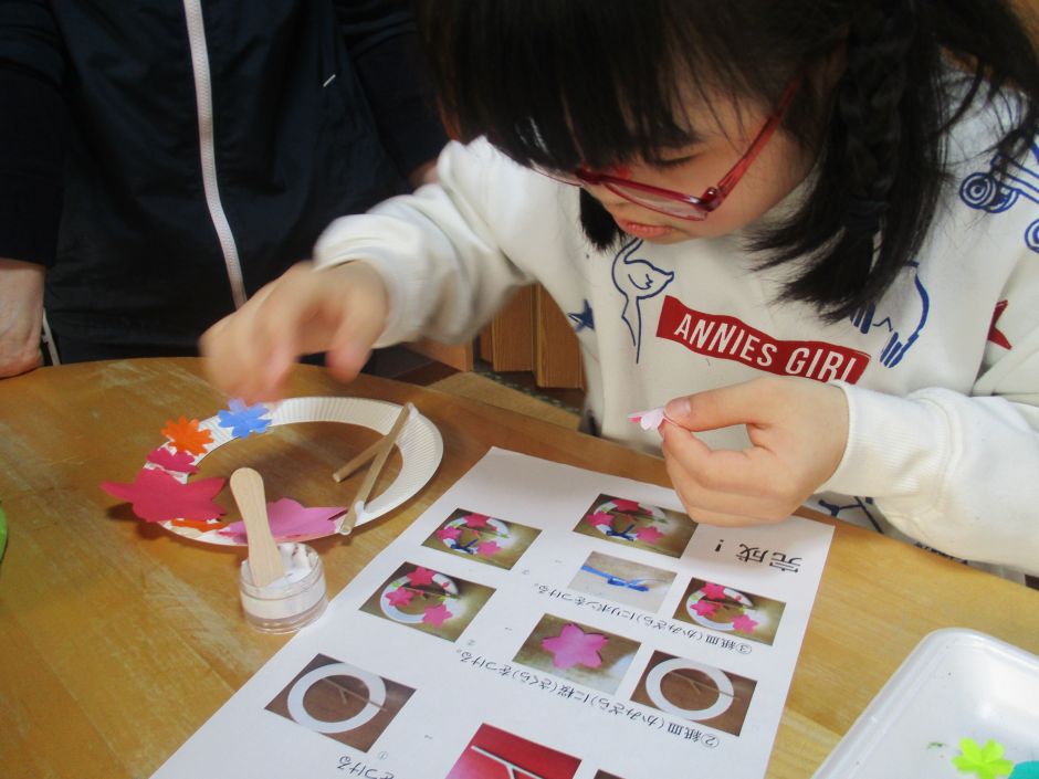 ぽかぽかした陽気のある日、桜のリース作りをしました。 ストローで作った枝と、画用紙や折り紙を使った桜の花を 紙皿のリースに貼っていきました。 手順書通りに作っていく子もいれば、自分でイメージして 作品にする子もいました。 子どもたちそれぞれの色合いのきれいな¨春¨ができあがっ ていました。