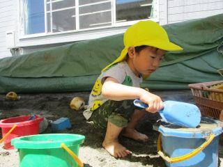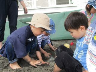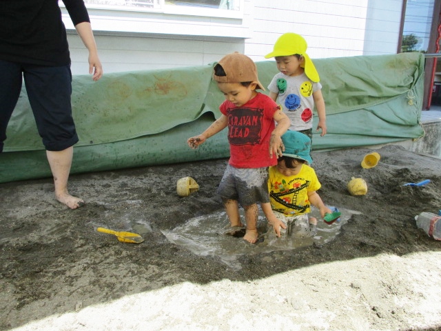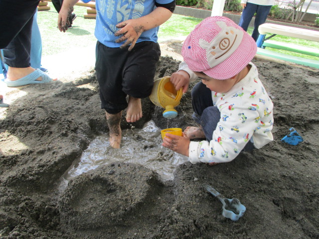 春の暖かい陽気からだんだんとジリジリした暑さに変わってきましたね!最近では気温が高くなってきたこともあり、園庭のお砂場ではお水を使って遊んでいます。さらさらした乾いた砂の感触から少しお水を含んで固まった砂の感触やたくさんお水を使ったどろどろの感触など様々な感触をみんな全身で楽しんでいます♪本格的な夏に向けて今からたくさん遊んで体力をつけていきたいですね^^