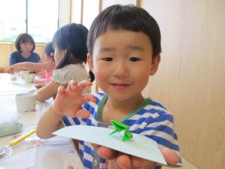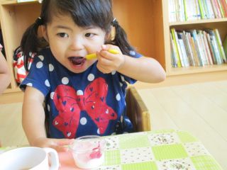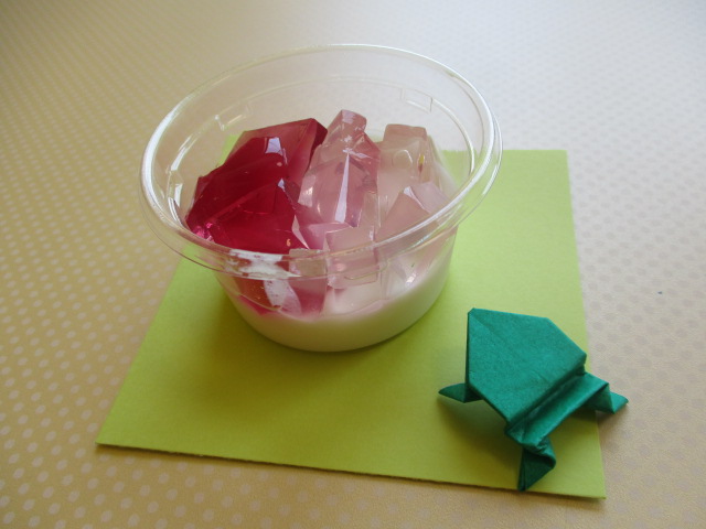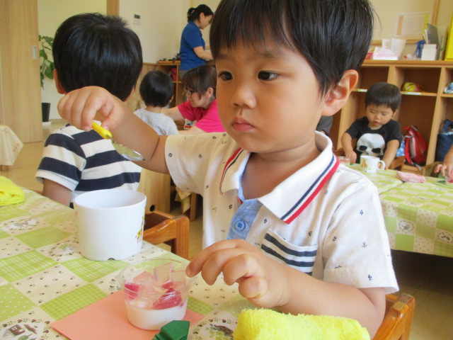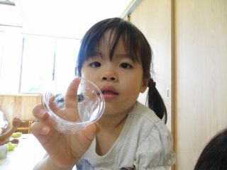 今年も、パン工房の皆さんがあじさいゼリーを作ってくれました。今回は紫色でとてもきれいにできていました。あじさいゼリーにカエルさんもいて、子どもたちは大喜び!!「先生、持って帰る!」と言って、カエルさんを大事に持って帰る子どもたちでした。