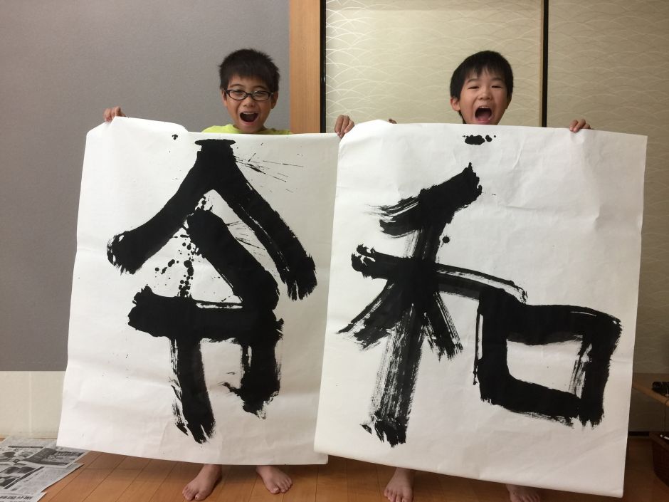まずは墨を磨ることに挑戦、墨の色や香りを楽しみながら好みの濃さの墨を磨りました。その後は自分で磨った墨を使って半紙に練習!筆は、ホロホロ鳥、竹、羊など様々な素材で書き比べながら楽しみました。最後は左手に墨の入ったバケツ、右手に巨大な筆を持ち大きな紙に書きました。その姿は書道パフォーマンスさながら!力強い『令和』の文字が完成しました。