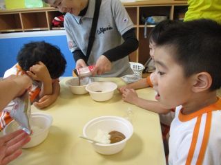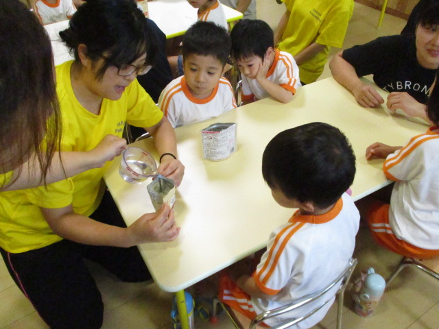 26日に水害による避難訓練をしました。避難経路を確認し、母子通園部門あははは、おかあさんと荷物を持って2階へ行きました。単独通園部門まんまるは、職員と一緒に避難しました。みんな落ち着いて行動することができました。給食では、防災非常食を作って食べました。ご飯はお湯を注いで20分程待ち、みんなで分け合ってカレーを食べました。子どもたちは「おいしい」と言って完食していました。