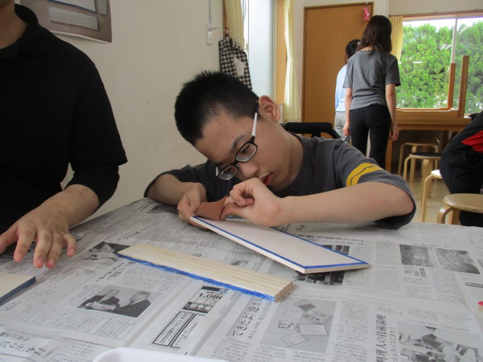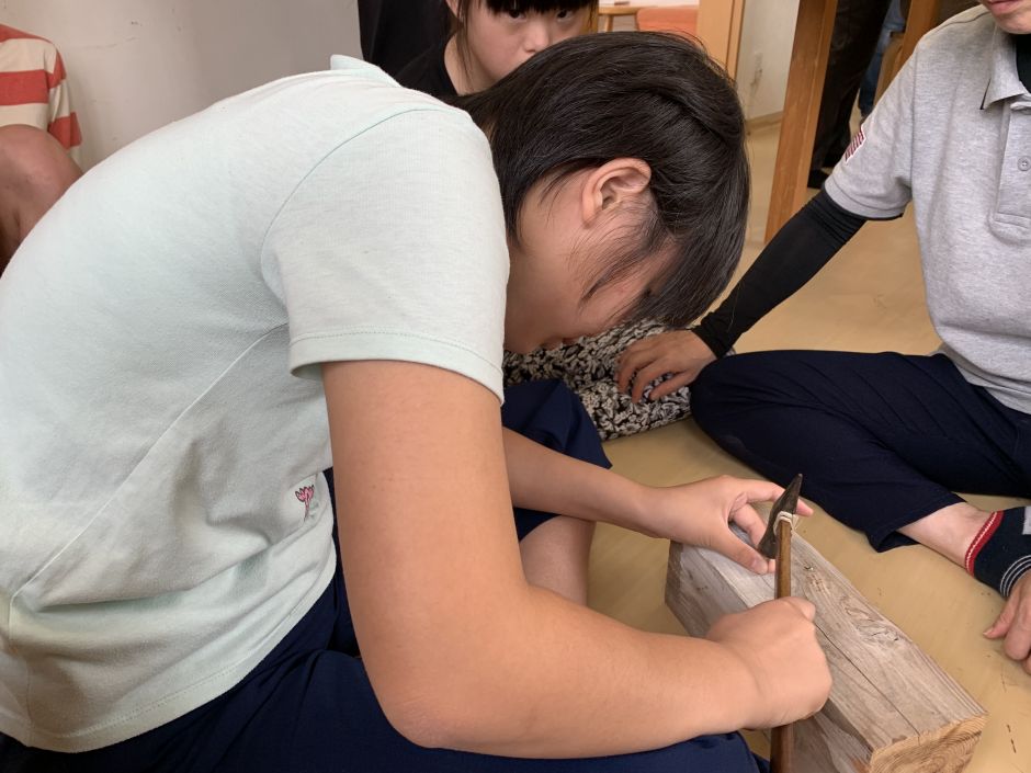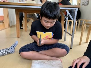 金づちで釘打ち、のこぎりで木を切る、木の表面をやすりかけ、木工用ボンドをつけて木を組み合わせるなどの体験をしてみました。 はじめはぎこちない手つきでしたが、回数を重ねるごとにコツをつかみ、後半には「棟梁!」と呼ばれるほどの釘打ち職人も。 「まだしたい!!」「他のコーナーにも行ってみたい。」との声も聞かれ、まだまだ終わりたくない様子の子どもたちでした(^0^) 部屋には、木の香りが漂い、いろいろな音が響き、子どもたちの達成感のような雰囲気も感じられ、心地よい時間でした。