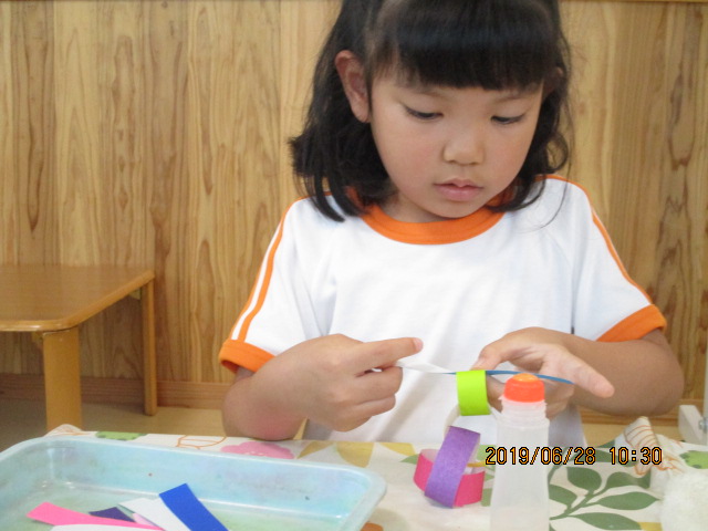 「これにする~」と自分で好きな色を使ったり、「もっともっと繋げよう」と言って輪を長くつなげようとしたり楽しみながら作っていました。
