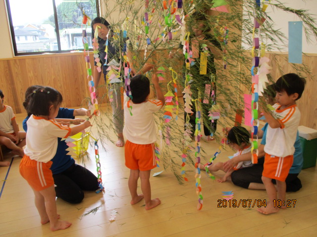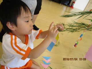 4日(木)にとんぼ・みつばち合同で笹に飾りつけをしました。