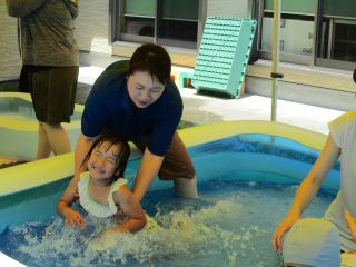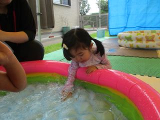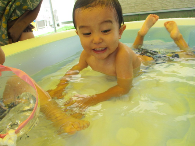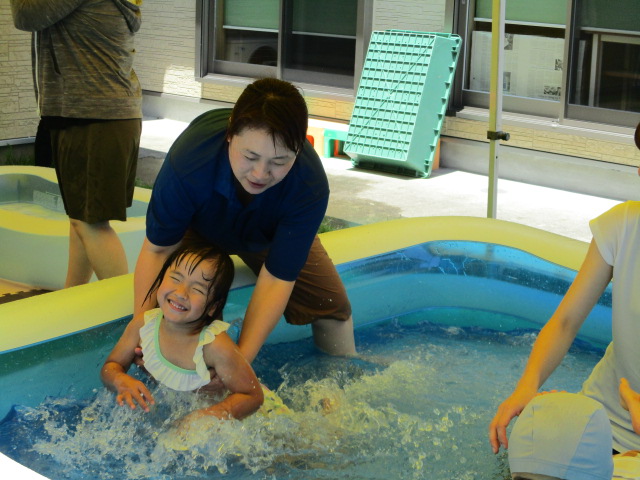 みずあそびが始まって、二週間が経ちました。最初は、軽く水を掛け合うくらいでしたが、今は思い切りプールの中で足をバタバタして水しぶきを楽しむ姿が見られました。また、朝のお集まりでやっている手あそびをみんなでプールの中で歌って水を掛け合いながらみんなで遊んでいました。