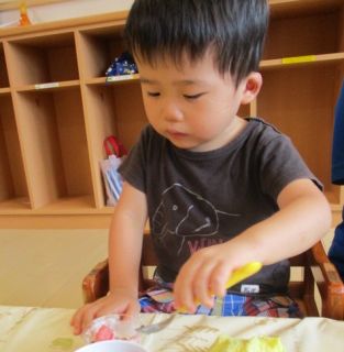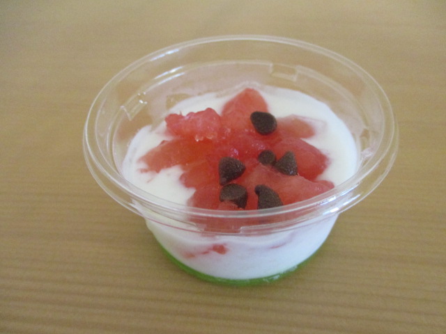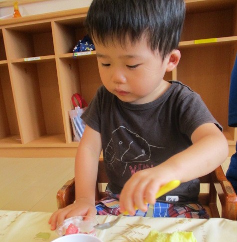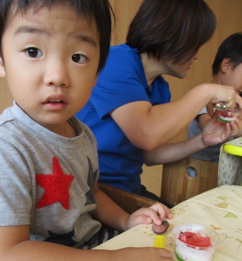 今日のおやつはスイカゼリーでした。はじめて見るおやつに「ん?」というような表情を浮かべる子ども達。不思議そうに覗き込んでどこから食べようか迷う姿があったり、ペロッと一口舐めてみる姿などいろんな表情を見せながら夏のおやつを味わっていました。