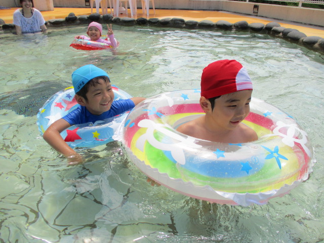 プールでは、お父さんやお母さんと一緒に大きなプールに入ったり、浮き輪にプカプカ浮かんでゆっくり過ごしたり、様々でした。