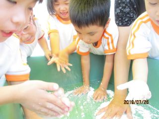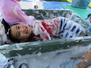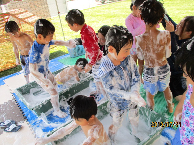まんまるお友だちは、感触あそびが大好きです(^^)/「粉」「泡」「小麦粉粘土」「スライムづくり」と満載です!なかでも特に好きなのが、泡あそびです!自分たちで泡立てたり、泡を体中につけたり・・・「おひげ~♪」と嬉しそうに遊んでいます。また体を洗う練習もしています!自分たちの身体に泡をつけ、「ゴシゴシ♪」と洗ったり、お友だちと洗いっこをして笑い合っています!夏にしかできないあそびをこれからも楽しんでいきます(*^-^*)
