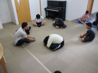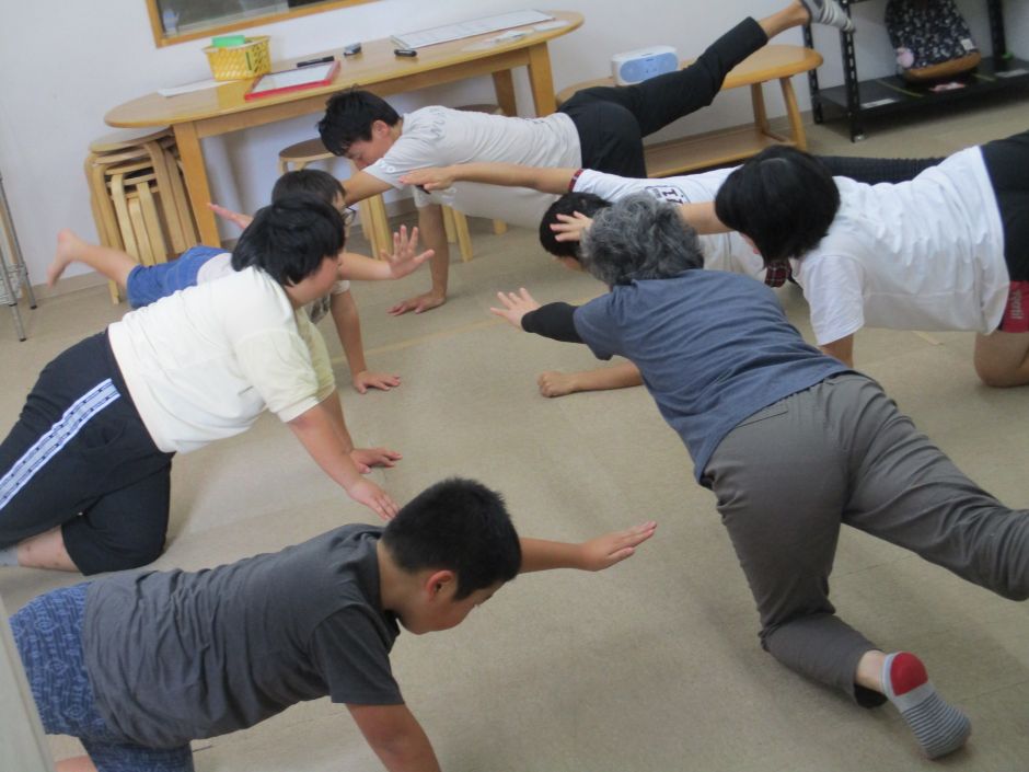 まずは、みんなで柔軟体操。体が柔らかい子や、「いたいー。」と叫び、