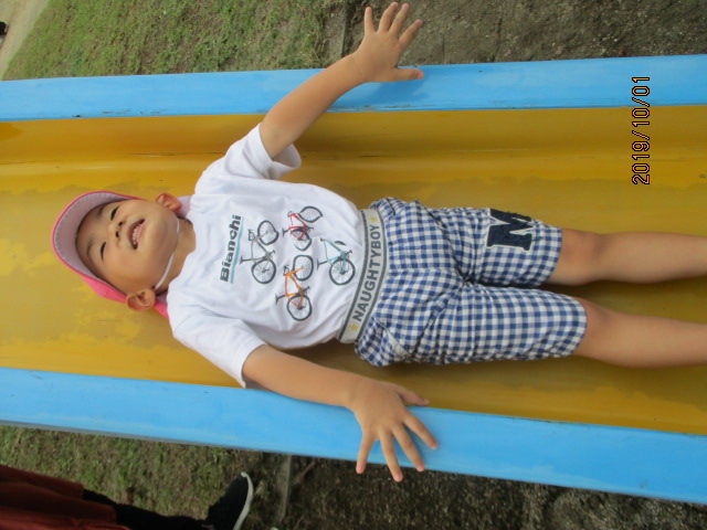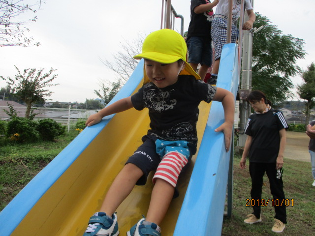 しばらく雨の日が続いている中、この日は曇り!!お母さんと一緒に野地公園に行って遊びました。あははにはない滑り台にみんな大喜びで勢いよく滑ったり、自分で滑る体勢を考えながら身体をたくさん動かして帰ってきました♪