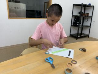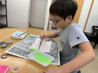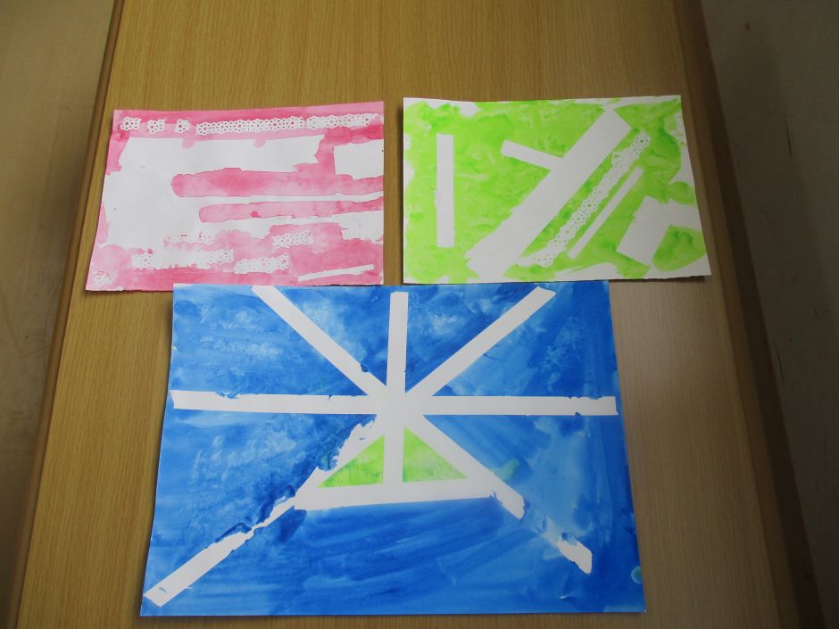 小学6年生を中心に「マスキングアート」をしました。画用紙に好きなようにマスキングテープを貼っていき、上から絵具を塗り、乾いて、ゆっくりテープをはがしていくと・・・・「わぁすげー。」「なんか変な形ができた。」「まだやりたい。」などさまざまな感想が飛び交いました。 世界で1つだけの作品が完成です。