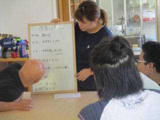 土曜日の「朝の会」の様子です。声かけされると、子どもたち同士で「はやく行くよ。」「こっち来んけ~。」と言い合いながら、部屋に移動してきます。 みんなが集まったら、呼名、健康観察、1日のスケジュール確認などを行います。みんなで集って、顔を見てお互いを確認する場になっています。 渋々参加・・・・という子どももいますが、帰りの会も同様に、毎日、毎回くり返しの中で定着してきています。