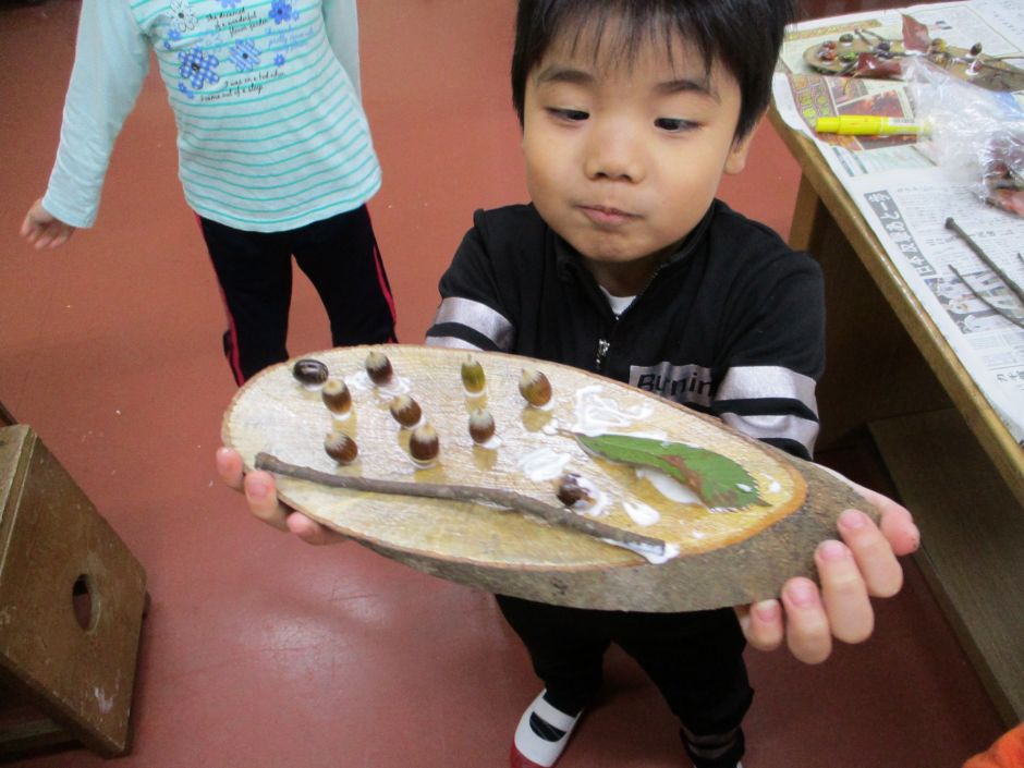 自分たちでどんぐりや枝、葉っぱを沢山拾い、木のプレートにボンドで貼り付けて行きました。
