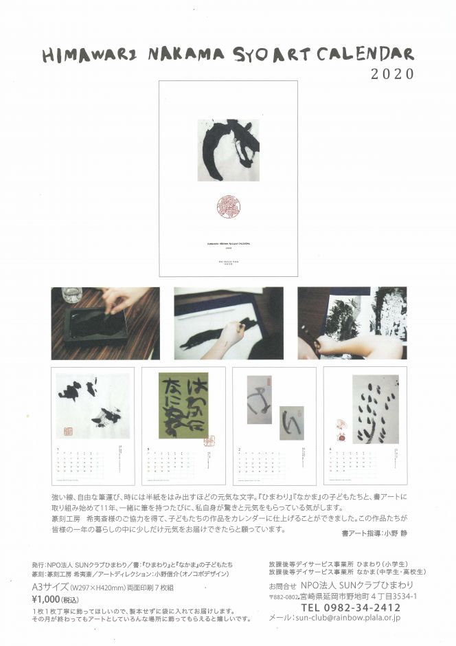 今回のカレンダーは、ひまわりとなかまで行っている、『SyoArt(書道)』の活動の作品で、とても素敵なカレンダーに仕上がっています。
