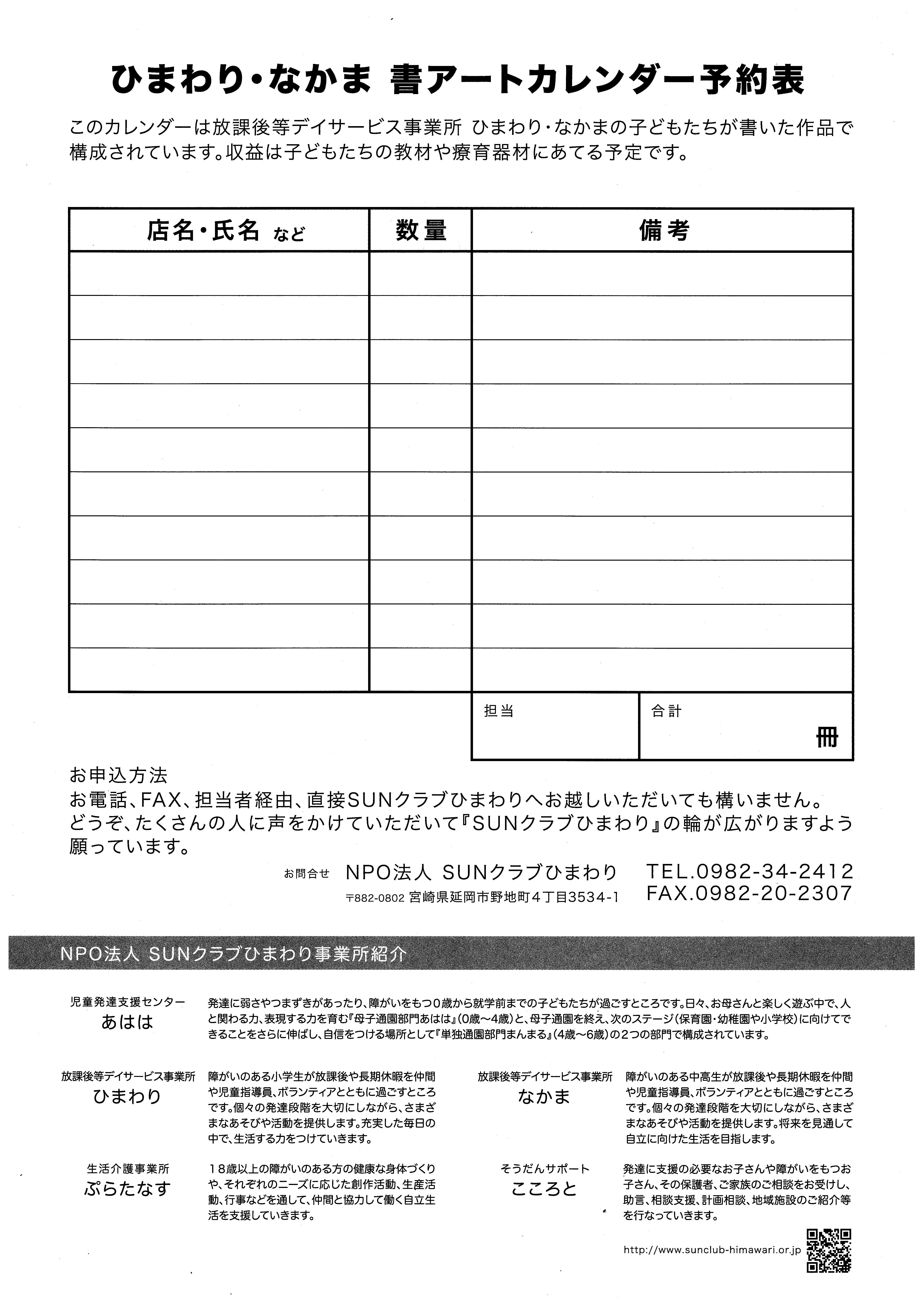 SUNクラブひまわりでは、例年各事業の広報と設備や教材の資金を集める目的で、カレンダー作成・販売を取り組んでおります。今年度は「ひまわり・なかま」の父母の会の活動の一環として担当していただきました。