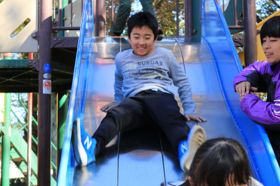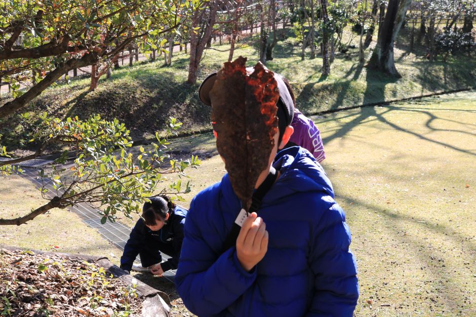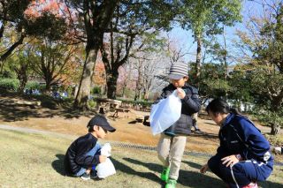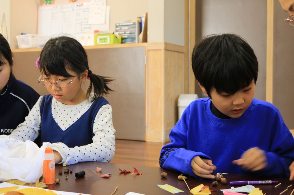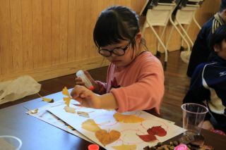11月30日土曜日に植物園に出かけました。イチョウの葉もきれいに色付き、黄色い落ち葉の絨毯がとてもきれいでした。 グループごとに園内を回り、色付いた落ち葉を拾ったり、面白い形の枝やどんぐりを見つけ、袋いっぱい集めて持ち帰りました。 午後からは、どんぐりゴマを作り対戦したり、集めた素材で思い思いの作品を作りました。落ちていた葉をまた枝に付ける子や、落ち葉アートを作るなど、子どもたちの面白い発想が作品に詰められていました。