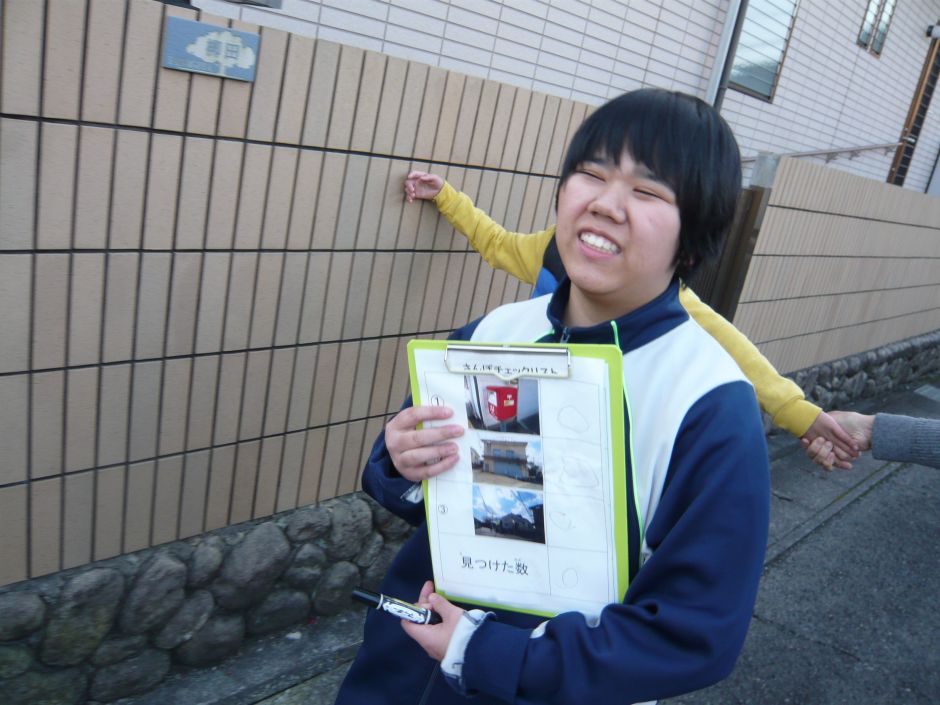 「今日の散歩は、どこに行くの?」と、散歩をとても楽しみにしている子どもたち。散歩コースにある郵便ポストや公園、自販機、看板などの写真のチェックリストを見ながら、同じものを探して歩きました。 見つかると「あったー。」と言い、楽しそうにチェックリストに〇をつけていました。
