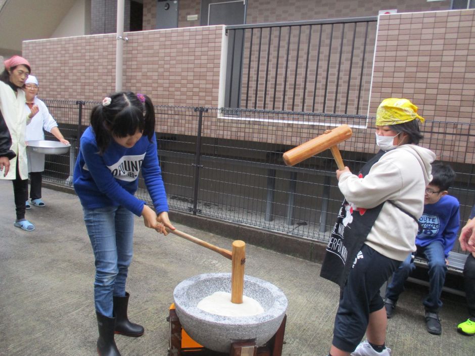 1人ずつ重い杵を手に、「1・2・1・2。」のかけ声に合わせて、交互にもちをつきました♪