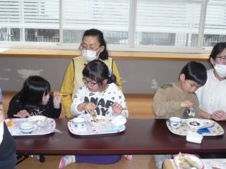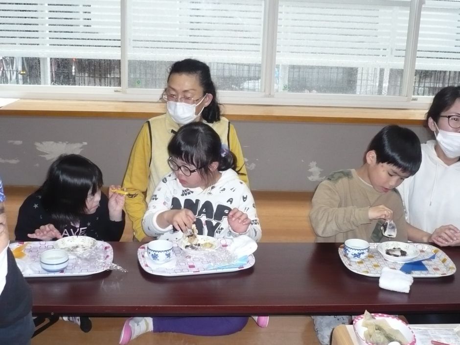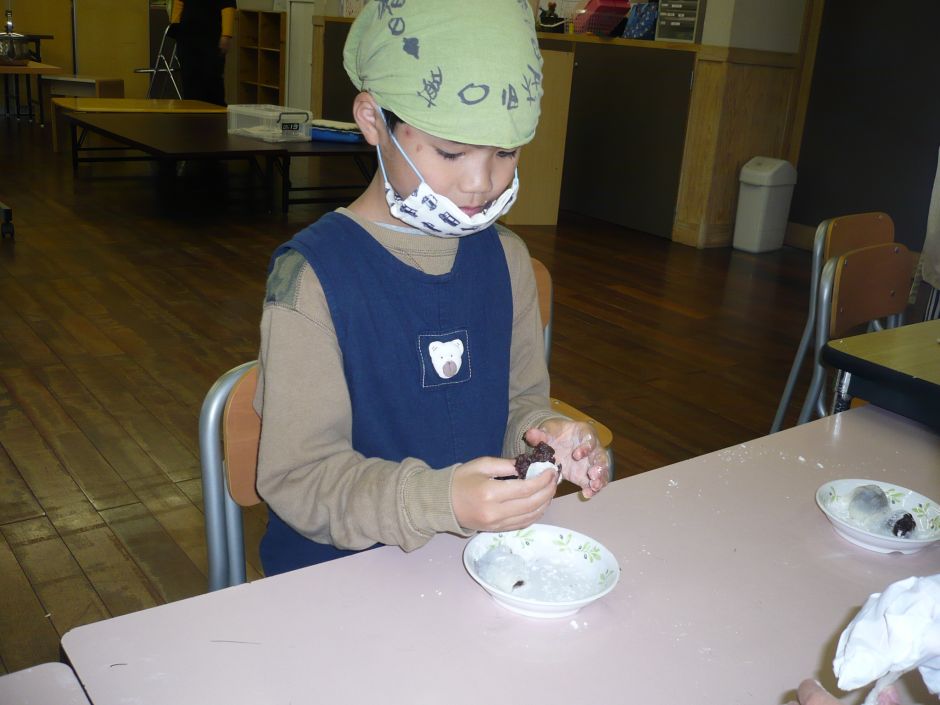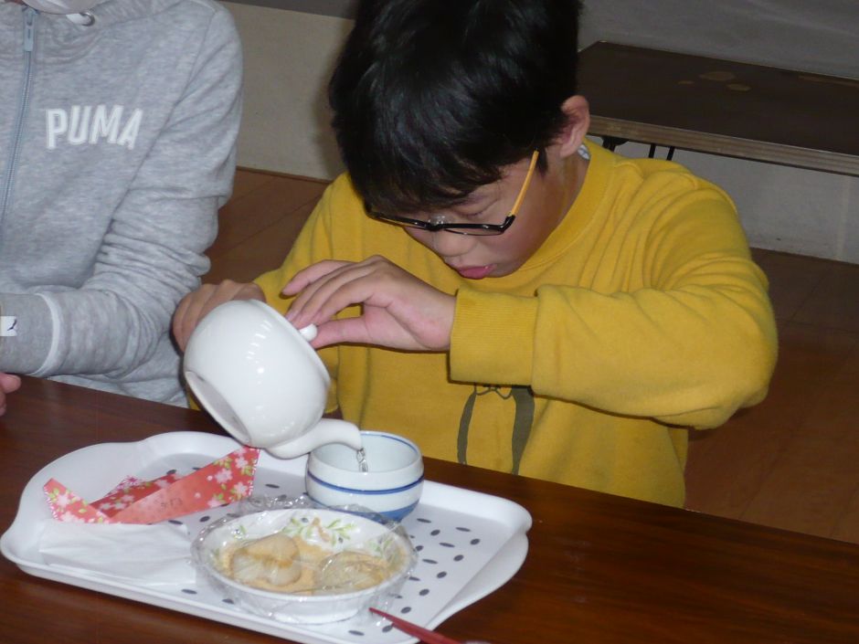 まずは、大福作り。生地作りは、白玉粉を水で溶いて、レンジで温めると、お餅に早変わり。その変化に「え、なんで~」と子どもたちは、とても驚いていました。自分の好きな量のあんこを入れて、完成させました!お茶会では、急須でお茶を入れることに挑戦。初めての子が多く、「飲みたくない」と言う子も。前日の練習の成果もあり、上手に急須で注ぐことができると、「上手にできた」「おいしい!」など、満足している子どもたちでした。